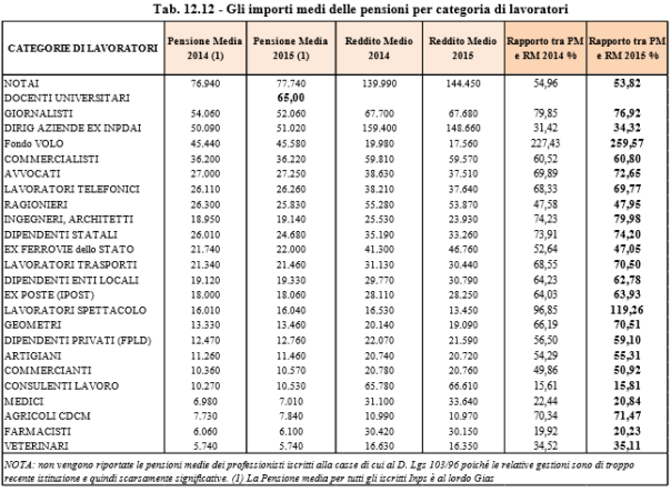 Il rapporto tra pensione e reddito che balza più all’occhio, per il suo squilibrio, è quello degli iscritti al fondo Volo (ossia piloti, assistenti e tecnici di volo, prevalentemente Alitalia, come fa notare Itinerari previdenziali), pari al 260%, poiché nel 2015 la pensione media risultava di quasi 46 mila euro contro i quasi 18 mila euro di reddito medio.