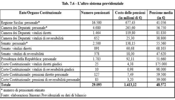 Se poi si prendono in considerazione anche gli enti e gli organi costituzionali, al primo posto della classifica dei pensionati con l’assegno più sostanzioso si trovano i giudici della Corte costituzionale. Sul secondo gradino del podio i senatori in pensione, i deputati e i consiglieri regionali; seguono i notai, e i pensionati della Suprema Corte, a loro volta incalzati dal personale in quiescenza di Camera, Senato e Presidenza della Repubblica.