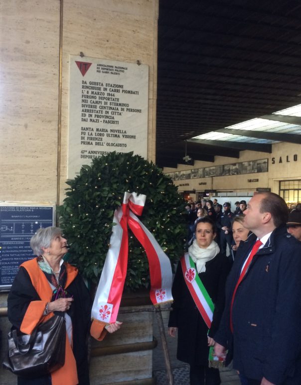 E nella tarda mattinata di stamane, proprio dinanzi a quella targa apposta a memoria imperitura all’inizio del marciapiede del binario 6, è stata deposta una corona di alloro per ricordare alla cittadinanza, anziani e giovani, quei drammatici eventi. Alla commemorazione erano presenti tra gli altri il presidente del consiglio comunale ass. Caterina Biti, la vice presidente della comunità ebraica fiorentina Daniela Misul , il sindaco di quella città dell’Austria, Thomas Punkenhofer. Accanto al gonfalone della città, e alle numerose bandiere e labari di enti ed associazioni, lo striscione portato a mano da un gruppo di studenti, recante la significativa scritta «Firenze – Mauthausen: città gemellate,la Memoria ha un futuro di Pace».