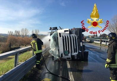 Il conducente del camion ha riportato gravi traumi in seguito al ribaltamento dell'autocisterna che stava guidando. Il veicolo trasportava ipoclorito di sodio: i vigili del fuoco hanno inviato squadre da Firenze e Siena per contenere la