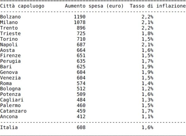Ad Ancona o Catanzaro i rincari sono quasi la metà: 412 euro nel primo caso e 459 nel secondo. Ecco una tabella con la spesa aggiuntiva per una famiglia di quattro persone e i tassi di inflazione città per città tra i capoluoghi (fonte: Unione nazionale consumatori su dati Istat).