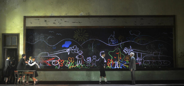 Non sarà invece forse soddisfatto chi cerca l’atmosfera magica e atemporale, gli esotismi e gli esoterismi presenti nel libretto di Schikaneder, che sono volutamente ignorati dal regista Damiano Michieletto, che trasporta l’azione in una scuola (senza tempo, ma i costumi sono novecenteschi): Sarastro è il preside, con insegnanti per sacerdoti; Papageno è il bidello analfabeta (che però sa parlare con gli animali); un po’ di magia è data dalla lavagna, che ogni tanto fa intravedere (con l’aiuto delle proiezioni di Carmen Zimmermann e Roland Horvath, altri scenari, tra cui il tempio di Sarastro; da lì esce anche il serpente di Tamino all’inizio). Le Tre Dame sono giovani suore, la Regina della Notte un’insegnante nevrotica e rovinata dalla superstizione, ostacolo primario alla vera sapienza. Dell’edizione veneziana si trovano video in rete, ma per farsi un’idea di quanto lo psettacolo funzioni realmente non c’è che vederlo sul palco.