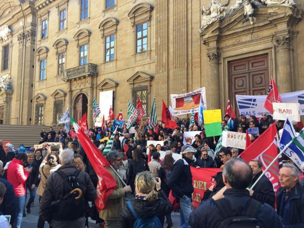 ha sfilato per le vie del centro storico di Firenze per concludersi vicino alla sede della Prefettura dove una delegazione di lavoratori e sindacalisti è stata ricevuta dal prefetto, Alessio Giuffrida. Molti i cartelli, gli slogan e le arie d”opera