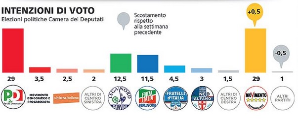Elezioni: gli ultimi sondaggi vedono in testa, di poco, il M5S appaiato con il Pd (29%), ma c’è equilibrio fra i tre poli