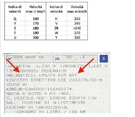 La lettera in questione, che appare sulla carta di circolazione, deve corrispondere a quella scritta sul fianco di ciascun pneumatico. È possibile – unicamente nel caso di quelli invernali – poter utilizzare pneumatici con un indice di velocità inferiore, ma di un solo livello. Ad esempio S anziché T e non R al posto di T. In estate invece è obbligatorio che la «lettera» che figura sul pneumatico corrisponda a quelle del libretto di circolazione.