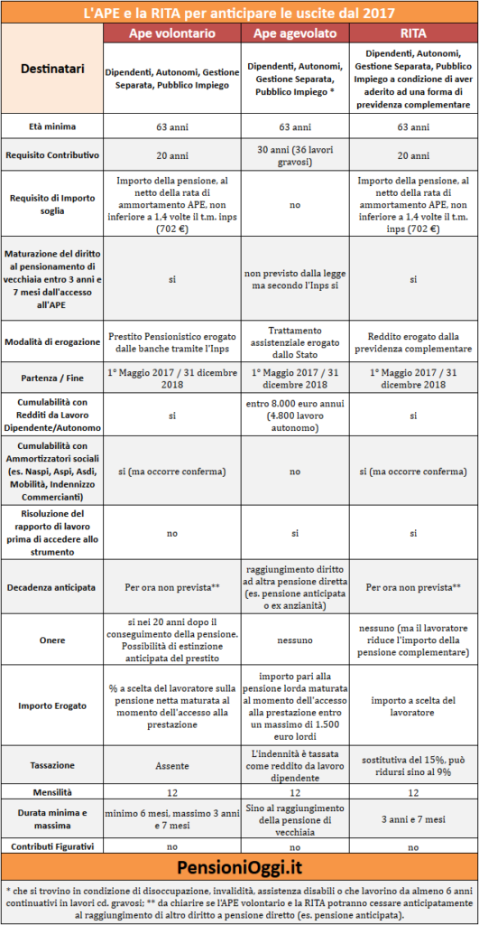 Pensioni: dall’Ape ai precoci, tutte le novità dal 1° maggio. La tabella riassuntiva