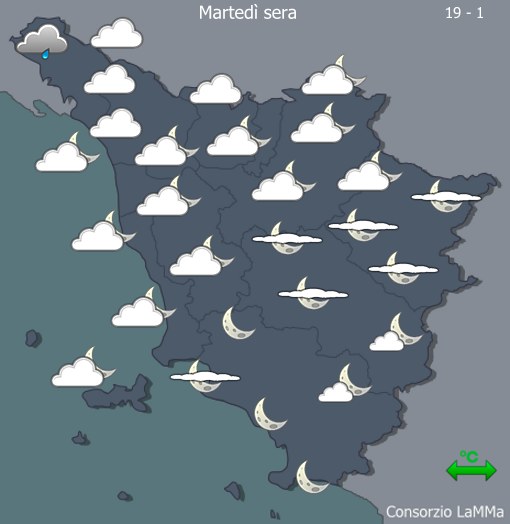 Martedì 25 aprile – Stato del cielo e fenomeni: molto nuvoloso con possibilità di locali piogge sulle provincia di Massa-Carrara, Lucca e Pistoia. Altrove parzialmente nuvoloso con schiarite nel pomeriggio e in serata in Maremma, sul senese e sull’aretino. Venti: moderati da sud sud est, forti dal pomeriggio su Arcipelago, costa e sottovento all’Appennino. Mari: generalmente mossi, tendenti a molto mossi in serata. Temperature: minime in aumento, massime stazionarie e in linea con le medie.