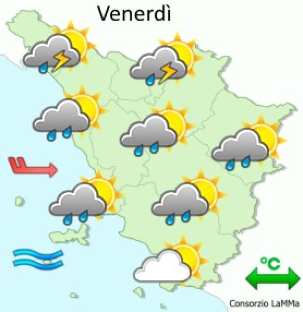FIRENZE – Le previsioni del Lamma per la Toscana nei prossimi giorni indicano che oggi potremo godere le ultime ore di sole poi, già da domani, a causa di una perturbazione in arrivo dal Nord Europa, arriveranno i primi temporali accompagnati da un nuovo calo delle temperature. Piogge e rovesci colpiranno in particolare l’alta Toscana. Già da martedì mattina il tempo sarà molto nuvoloso con possibilità di piogge sulle provincia di Massa-Carrara, Lucca e Pistoia. Da mercoledì fino a venerdì la situazione peggiora ulteriormente: le province di Massa-Carrara, Lucca Pisa e Pistoia saranno caratterizzate da un cielo molto nuvoloso con precipitazioni diffuse e persistenti. Piogge anche sulle province di Livorno, Prato, Firenze e Arezzo.