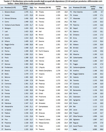 La provincia del capoluogo altoatesino è quella con gli stipendi medi più alti d’Italia – 1.476 euro – e allo stesso tempo quella con il minor numero di disoccupati sul totale della popolazione. Seconda in classifica Varese, seguono Monza e Brianza (1.456), Como (1.449), Verbano Cusio Ossola (1.434), Bologna (1.424) e Lodi (1.423). Tutte province del Nord, più il capoluogo emiliano. Male il Sud, una via di mezzo il Centro.