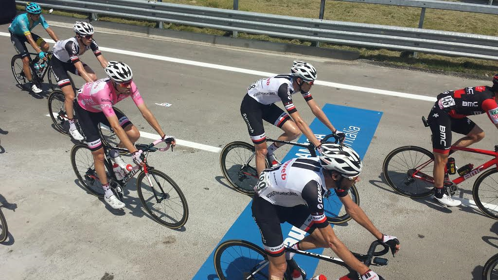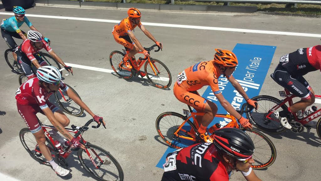 Il momento fatidico dell’entrata dei corridori in autostyrada, a Barberino del Mugello. Sopra, al centro, la maglia rosa Dumoulin (Foto Palinko/Gilda)