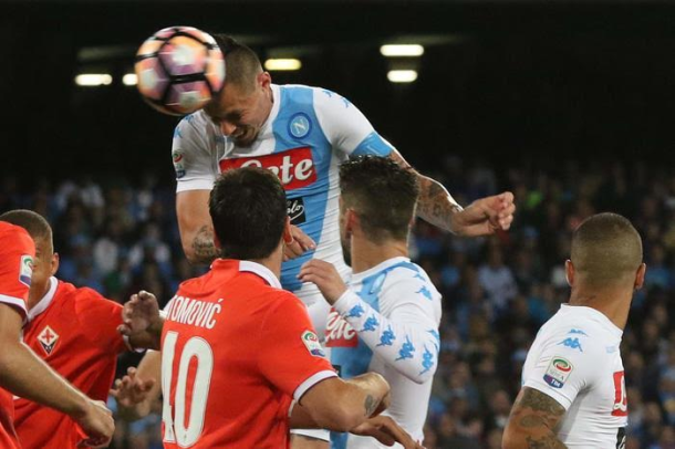 ILICIC – E’ una Fiorentina imbarazzante. Come si fa ad essere così ingenui e scombinati a una giornata dalla fine del campionato? Come si fa a scendere a Napoli con poche idee e tutte confuse. La posizione di Berna grida vendetta. Maxi Olivera, con i suoi limiti, fa anche troppo. La difesa sembra una galleria dove hanno buttato giù l’ultimo diaframma: passa di tutto. In avvio di ripresa, Bernardeschi riesce ad essere pericoloso anche dalla sua strana posizione. Reina para. Sale un po’ la Fiorentina, ma Ilicic e Kalinic non trovano la porta. Quindi Sousa fa la mossa coraggiosa: dentro Tello e Babacar, fuori Maxi Olivera e Cristoforo. Difesa a tre, ma chi cercherà di fare barriera a metà campo? E infatti passano pochi minuti e il Napoli trova il terzo gol. Angolo di Callejon, pallone che spiove nell’area piccola, Tata esce a vuoto con i pugni e Mertens la mette dentro . E’ il 12’. Tre a zero. Il Napoli sembra appagato. La Fiorentina ci prova e trova il gol. Al 15’ spunto di Tello sulla sinistra, Ilicic ci mette il piede sinistro e infila Reina all’angolino. Troppo tardi? Bernardeschi (17’) fa tremare i difensori con un tiro violento che va di pochissimo fuori. Ma è fuoco di paglia: quando il Napoli affonda non c’è niente da fare. Il quarto gol arriva presto. Mertrensa fa il tunnel a Gonzalo, serve Hamsik che prova il destro, Tata respinge e Mertens segna il suo secondo gol. E’ il 19’. Povera Fiorentina! Poco dopo è Tatarusanu a salvare il quinto gol su Mertens. Ma ormai è una squadra sbilanciata, quella viola, e si espone a un punteggio che può diventare devastante. Sarri toglie Mertens, salutato da standing ovation. Giustissima. Ha fatto un gran campionato e non era semplice: doveva non far rimpiangere Higuain. Entra Pavoletti, finora sacrificato, ancora alla ricerca del suo primo gol in maglia napoletana. Paulo Sousa toglie Kalinic (30’) e manda in campo un giocatore che non è fra i suoi preferiti: Saponara. Babacar avrebbe la palla per segnare il secondo gol (38’) ma calcia male e Reina può deviare. Ma tanto non si rimedia più a nulla. Il fischio finale viene accolto come una liberazione dai duecento eroici tifosi viola scesi al San Paolo.