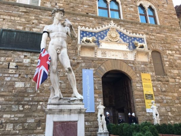 Firenze: David in Piazza Signoria con bandiera uk in mano e lutto al braccio. Condanna dell’attentato di Manchester