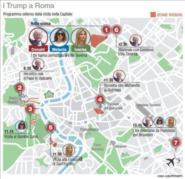 ROMA – Il presidente Usa Donald Trump è giunto a Roma. Il suo aereo, l’Air Force One, è atterrato sulla pista 3 di Fiumicino. Trump si è affacciato dal portellone dell’aereo salutando a più riprese, con ampi gesti della mano, tutti i presenti. La coppia presidenziale è stata accolta dal ministro degli Esteri Angelino Alfano. Un paio di minuti dopo è stata la volta della figlia Ivanka e del genero Jared Kushner. Anche loro, mano nella mano, si sono intrattenuti con le autorità presenti. Subito dopo il presidente ha lasciato l’aeroporto con un lungo convoglio di auto per dirigersi a Villa Taverna, residenza dell’ambasciatore americano a Roma. Oltre 70 le auto del corteo, scortato da guardie del corpo e forze dell’ordine.
