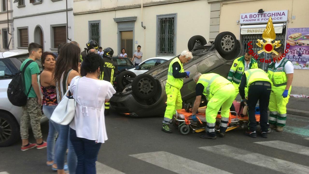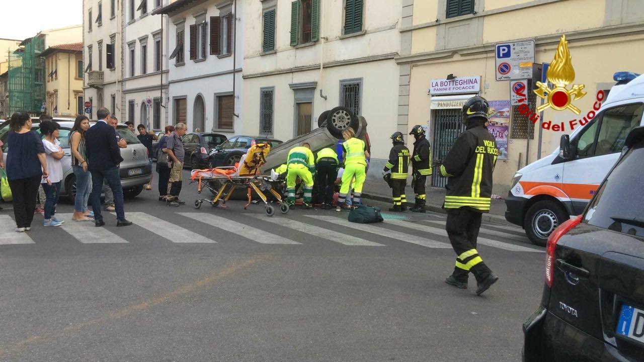 Firenze, incidente stradale: auto si ribalta in via Carnesecchi. Donna sbalzata dalla macchina. Ferito anche il marito (Foto)