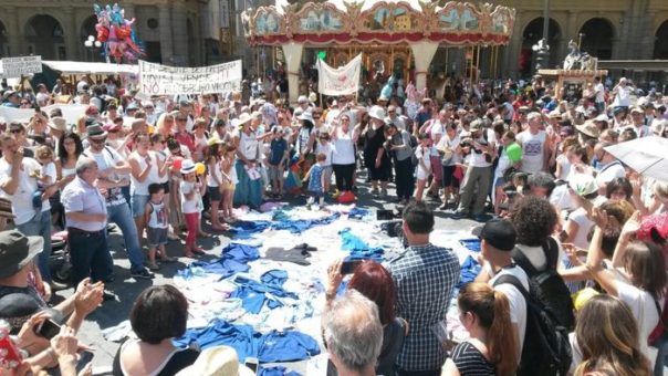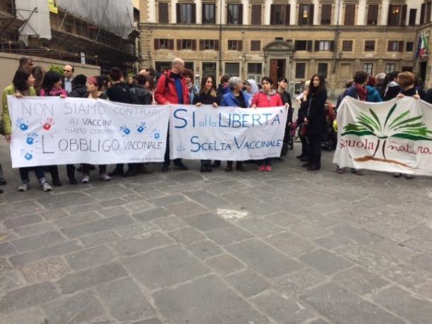 FIRENZE – Decine di grembiuli scolastici gettati in terra contro l’obbligatorietà della vaccinazione per i bambini, pena la sanzione della non ammissione a scuola. Questo il gesto simbolico di maggior rilievo fatto stamani a Firenze da una manifestazione di famiglie contro il decreto del ministro Lorenzin e alla quale ha partecipato anche Dario Mieico, il medico legale radiato dall’Albo dall’ordine di Milano perché schierato contro i vaccini obbligatori. Alla fine di un corteo che era partito da piazza san Lorenzo, i partecipanti, circa 1.500 secondo le autorità, hanno raggiunto piazza della Repubblica dove hanno disseminato sul selciato i grembiuli, azzurri e rosa. La manifestazione, con al seguito numerosi bambini, era aperta da uno striscione con la scritta Con la salute non si scherza, libertà di scelta e sicurezza a rivendicare, come è stato ribadito, il diritto delle famiglie di decidere se vaccinare o meno i figli: gli stessi temi sono stati al centro di un convegno con esperti svoltosi al Cinema Odeon, nel centro storico del capoluogo toscano. Presenti famiglie arrivate da tutta la Toscana ma anche da altre regioni tra cui Marche, Veneto e Umbria. Altra manifestazione analoga è stata organizzata anche a Marina di Carrara.