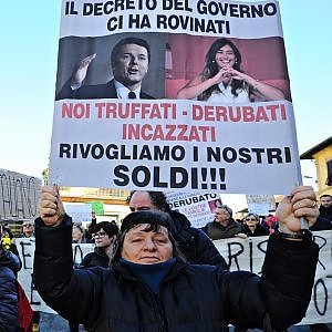 I risparmiatori che hanno perso tutto con la risoluzione delle 4 banche non si rassegnano. Non si rassegnano ad essere trattati come risparmiatori di serie B, ad essere gli unici azzerati della storia del risparmio italiano – si legge in un comunicato diffuso dall’Associazione Vittime del Salvabanche con allegate le foto degli striscioni – Non si rassegnano a dover pagare con i sacrifici di una vita gli intrighi e gli intrallazzi di banchieri massoni, o semplicemente corrotti.