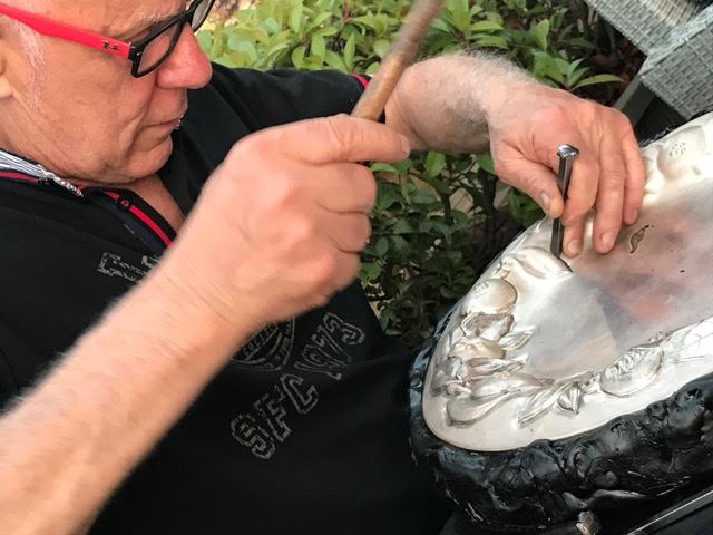 Ecco dunque la scelta di Bianca di recuperare l’azienda e affiancare la tradizionale produzione Brandimarte a nuove idee per il futuro. Al party organizzato nella splendida cornice del Ristorante-Caffè La Loggia al Piazzale Michelangelo era stato allestito un angolo in cui uno degli artigiani più rappresentativi dell’azienda, Mauro Pini, mostrava la tecnica dello sbalzo per la creazione di vassoi tondi e rettangolari.