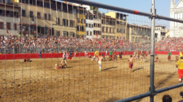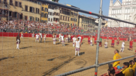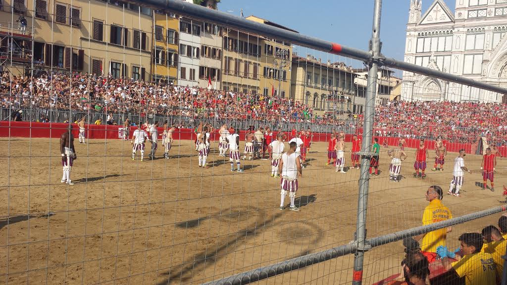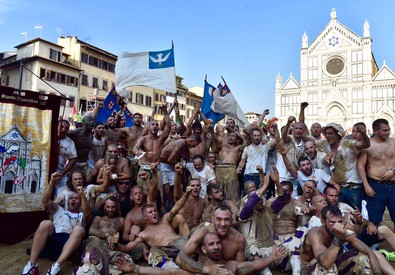 FIRENZE – Finale bellissima. Anche se capace di provocare l’aritmia a tutti. Pensate: a una manciata di secondi dalla fine i Rossi, dopo una gran rimonta, stavano vincendo per cinque cacce e mezza a cinque. Questione di attimi, cuori in gola da una parte e dall’altra, pallone che rotola sulla sabbia e sulla pelle dei calcianti coperta di sangue e di sudore. Lorenzo Ardito, nipote di Gaetano, pugile che portò la corona europea in San Frediano, riesce a rimettere le mani su quella benedetta o maledetta sfera. Ha già fatto due cacce che potrebbero non essere servite a niente. Vede la caccia rossa, stringe i denti, forse chiude anche gli occhi: però tira. Il pallone va verso la balaustra, rimbalza sulla sabbia e, beffardo, s’infila in caccia davanti alla curva rossa. Con la tifoseria di Santa Maria Novella che piange dopo aver esultato fino a un attimo prima, quando credeva di aver vinto dopo una strepitosa rimonta. Invece è quel pallone irriverente che decide, dopo un rimbalzo e l’altro.