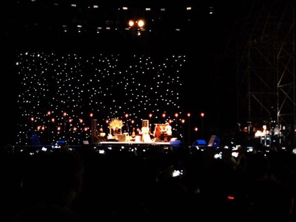 Visibilmente emozionato, specie all’inizio (ha detto che era la prima volta che cantava da solo davanti a un pubblico così numeroso, e più volte, durante la serata, ha guardato con espressione stupita il mare di gente che gli stava davanti; nella foto, il pubblico visto dal palco), ha avviato con «Elderly Woman behind a small counter» (dall’album «Versus», 1993), solo voce e chitarra: la sua bella voce baritonale e ben timbrata, inconfondibile; poi è stato tutto un crescendo, col pubblico sempre più coinvolto e in visibilio. Tre chitarre, un ukulele, un mandolino, un organo: sul palco apparecchiato con un po’ di scenografia passava da uno strumento all’altro e ai suoi pezzi ha inframezzato alcune cover (John Lennon, Cat Stevens, Neil Young). Per il gran finale è salito a dargli man forte anche Glen Hansard. Non è mancata la dedica all’amico Chris Cornell, suicida poche settimane fa: Black, cantata, su suo invito, da tutto il pubblico. Anche questo dà la misura di quanto un artista in attività dal 1990 possa essere ancora attuale: molti i ventenni e trentenni degli anni Novanta, fra il pubblico, ma molti di più i nativi di quel decennio e addirittura qualche adolescente, e quasi tutti avevano l’aria di conoscere bene tutto il repertorio.