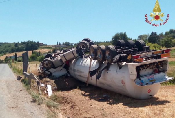 Peccioli, strada regionale 439: autocisterna Gpl si ribalta, ferito il conducente, circolazione sospesa (Foto)
