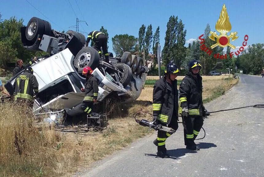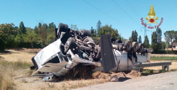 Per cause in corso di accertamento l’autista ha perso il controllo del mezzo finendo fuori strada cappottando e rimanendo incastrato all’interno della cabina.