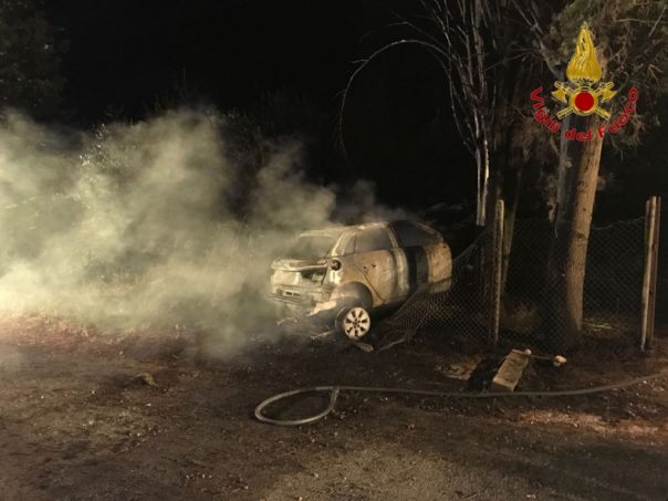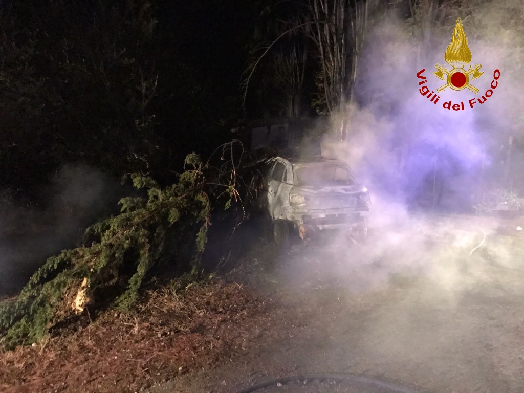 L’auto in fiamme con il cadavere carbonizzato in località Le Piscine a San Miniato (Foto vigili del fuoco)