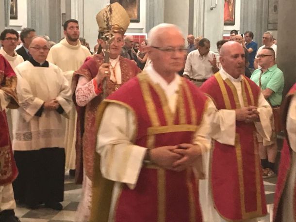 FIRENZE – Partecipata messa di San Lorenzo nell’omonima Basilica, officiata dal cardinale Giuseppe Betori, Arcivescovo di Firenze. All’inizio della cerimonia il Sindaco Nardella ha donato al priore mitrato della Basilica, Mons. Marco Domenico Viola, i ceri votivi offerti dal Comune. Insieme a Lui la vicesindaca Cristina Giachi, assessori e il presidente del Consiglio di Quartiere 1 Sguanci.