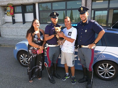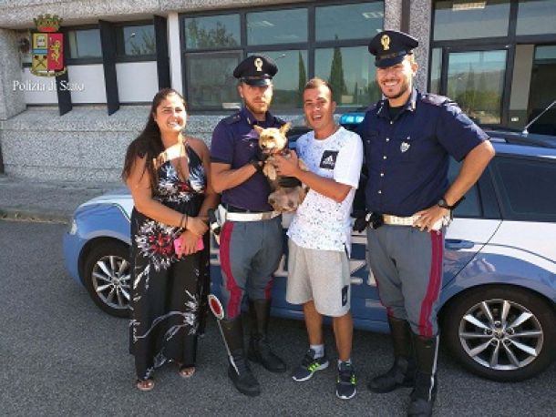 Ciko inizialmente era diffidente, ma non appena i poliziotti gli hanno dato dei biscottini si è tranquillizzato e si è fatto coccolare e portare in caserma, dove ha potuto così riabbracciare i suoi padroni, tornati subito indietro per riprendere il loro amico a quattro zampe.