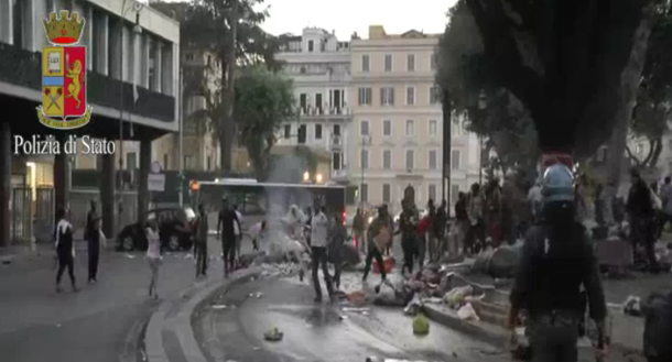 ROMA – Lo sgombero dei rifugiati e richiedenti asilo nel centro di Roma dopo cinque giorni si è trasformato in scontri della polizia con alcune decine di migranti rimasti accampati in piazza Indipendenza e è deflagrato anche in campo politico. Colpiscono le immagini degli eritrei che rifiutano di sgomberare le aiuole e vengono dispersi con i cannoni ad acqua dalle autoblindo della polizia; tra loro anche diverse donne, inginocchiate, con le braccia alzate, travolte dal getto dell’idrante. Ma anche quelle delle bombole del gas lanciate dalle finestre dello stabile contro le forze dell’ ordine. Ai rifugiati si sono uniti i professionisti della protesta violenta, i militanti radicali dei movimenti per la casa.