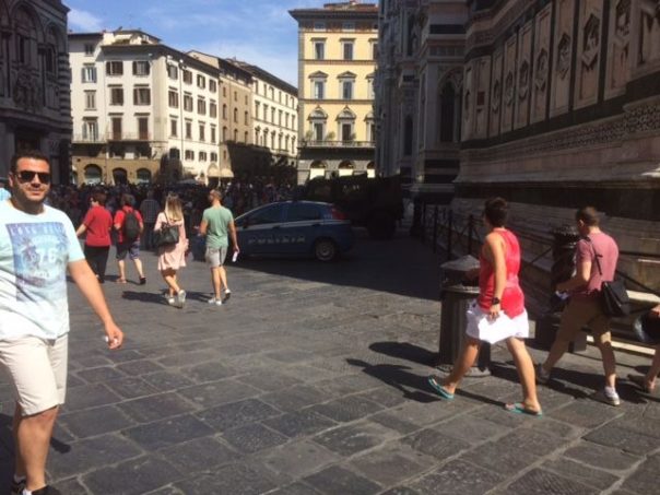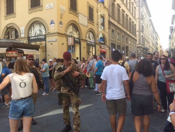 PIAZZA DUOMO – VIA CALZAIUOLI – Esiste una barriera umana di turisti che sostanzialmente impedisce o rende difficoltoso qualsiasi accesso da e per il Duomo. I soldati armati sorvegliano con discrezione, camionette della Polizia e dell’Esercito sono posizionate sotto il Campanile di Giotto. La difesa è affidata alle pattuglie più che ai sistemi di dissuasione.