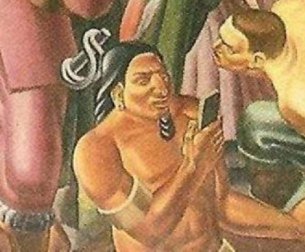 Dopo tante ipotesi una risposta sembra essere arrivata grazie a Daniel Crown. Il celebre storico è certo che l’oggetto dipinto dal pittore italiano sia un piccolo specchio, molto utilizzato nel XVII secolo. “Potrebbe essere benissimo che l’uomo si stesse specchiando nell’oggetto che aveva in mano – ha svelato -. Quando Romano ha dipinto il murale, l’America era ossessionata dalla nozione di ‘buon selvaggio’. Si tratta di un uomo appartenente a una comunità arretrata attratto dalla modernità, rappresentata da oggetti lucenti”. Di parere diverso il dottor Bruchac, secondo cui sarebbe una lamiera di ferro, compatibilmente con il “genere artistico romantico” a cui appartiene l’opera di Umberto Romano.