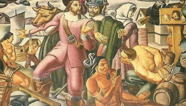 In questi giorni sul web si parla molto del dipinto realizzato dall’artista italiano intitolato “Mr. Pynchon and the Settling of Springfield”. L’opera racconta l’incontro del 1630 fra due tribù del New England, i Nipmuc e i Pocumtuc, con i coloni inglesi che provenivano dal Massachusetts. Fra i particolari che attirano immediatamente l’attenzione ce n’è uno che sta facendo molto discutere.