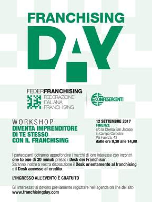 Si svolgerà martedì 12 settembre, presso la Chiesa San Jacopo in Campo Corbolini (Via Faenza 43 – Firenze), il Franchising Day. L’iniziativa inizierà alle 9.30 con i saluti di Nico Gronchi Presidente Confesercenti Toscana, Alessandro Ravecca Presidente Nazionale Federfranchising e Raffaele Madeo Presidente Federfranchising Toscana. Dalle ore 10.00 l’inizio dei lavori.