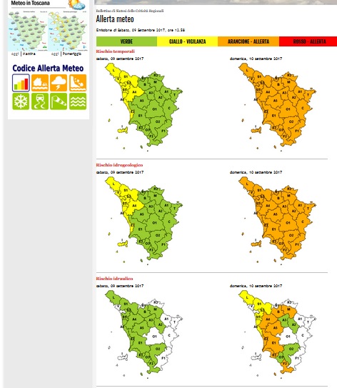 Cominciamo da quel 9 settembre, quando, alle ore 13,56, la sala operativa della Protezione civile regionale aveva emesso un avviso di criticità per tutta la Toscana, codice arancione, a partire dalla mezzanotte di oggi fino alle 24 di domenica 10 settembre, avviso poi ripetutamente confermato, ma sempre mantenendo il livello arancione. Questo il testo: «A causa di una perturbazione atlantica che attraverserà la regione, sono attesi forti precipitazioni e temporali, con possibili rischi di carattere idraulico sui corsi d’acqua maggiori e idraulico e idrogeologico sul reticolo minore. I fenomeni interesseranno inizialmente le aree nord-occidentali (notte di sabato e di domenica), per poi estendersi a tutte le altre aree, con tendenza, nella giornata di domani, ad interessare maggiormente i bacini centro-meridionali e orientali. Le precipitazioni potranno risultare localmente molto intense e persistenti. La Protezione civile raccomanda di fare attenzione all’aperto, in particolare in presenza di alberi e strutture temporanee o pericolanti e nei centri urbani. E invita a guidare con attenzione, in particolare sui tratti esposti alla caduta di piante e sassi. Per informazioni più dettagliate sui rischi e le norme di comportamento da tenere in occasione di tali fenomeni consultare la pagina www.regione.toscana.it/allertameteo/.»