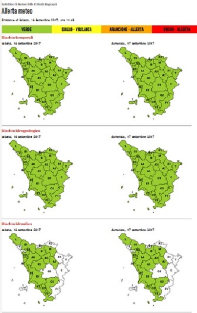 Poi, d’improvviso, il miracolo. Prima l’allarme è ridotto alle sole province meridionali (Arezzo, Siena e Firenze), in seguito addirittura diventa tutto verde. La schermata a destra, ripresa dal sito della regione alle ore 11,28 di oggi 16 settembre, è particolarmente significativa. E’ dunque rientrato in anticipo l’allerta arancione che la Sala operativa della Protezione civile della Toscana aveva diramato dalla mezzanotte di ieri fino a stamani.