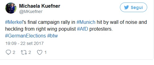 «Si percepisce che viviamo in tempi insicuri. E ci troviamo di fronte a grandi sfide. Abbiamo bisogno di una politica di centro, che abbia il senso della misura», ha detto la Merkel facendo chiaramente riferimento alle contestazioni che stanno ostacolando il suo comizio, presumibilmente dai populisti di AFD.
