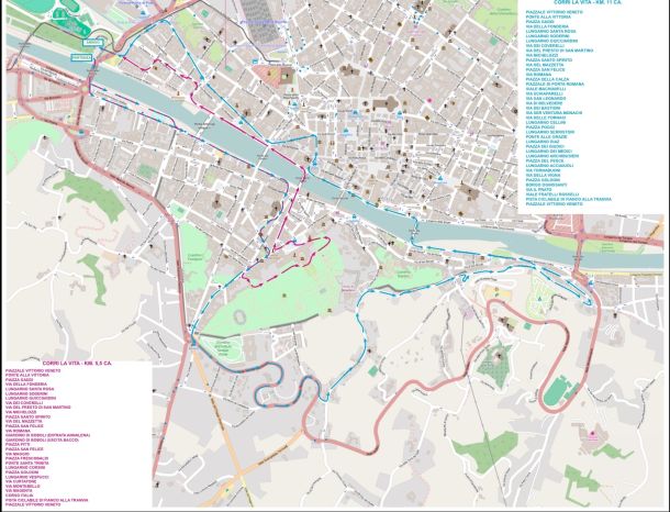 Il percorso della corsa non agonistica avvolge la città e tocca anche il Piazzale Michelangelo e il Giardino di Boboli. I pettorali saranno dotati di chip e quindi gli atleti avranno il loro tempo cronometrato. Dalle Cascine ci si dirige verso Ponte alla Vittoria e si va sui lungarni in Oltrarno, si tocca Piazza Santo Spirito si arriva fino al piazzale di Porta Romana, sulla falsariga del tracciato della Firenze Marathon (che tornerà il prossimo 26 di novembre). Da qui si sale fino ad arrivare al Piazzale Michelangelo e si costeggia anche Forte di Belvedere. Poi una volta ridiscesi, giro di boa in lungarno Ferrucci e attraverso i Lungarni si ritorna verso le Cascine, si attraversa l’Arno al Ponte alle Grazie e da qui si continua sostanzialmente diretti, fatte salvo quattro sterzate, di nuovo verso Piazzale Vittorio Veneto, l’Arrivo.