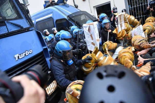 Decine di grossi petardi sono stati esplosi dai manifestanti anti G7 arrivati in piazza Vittorio Veneto, nel centro di Venaria Reale presidiato dalle forze dell’ordine che bloccano gli accessi alla Reggia. Alcuni sono stati lanciati contro le forze dell’ordine, ad altezza uomo, schierate in assetto antisommossa. I manifestanti hanno tentato di forzare il cordone delle forze dell’ordine ma sono stati respinti. La polizia ha risposto con una carica di alleggerimento per allontanare i dimostranti.
