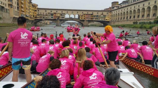 FIRENZE – Per il Pink October 2017, mese internazionale di prevenzione del tumore al seno, il cuore di Firenze si è colorato di rosa per opera di Firenze in rosa onlus, nell’intento di diffondere una cultura della prevenzione attraverso diagnosi precoci e la promozione della salute e di corretti stili di vita. E’ stata infatti un’onda rosa quella che stamani ha attraversato l’Arno partendo da Ponte Vecchio fino a Palazzo Corsini, dove 30 imbarcazioni hanno eseguito una coreografia per salutare la Biennale dell’Antiquariato di Firenze, che proprio oggi chiude la sua 30ª edizione. Tutti gli stand presenti a Palazzo Corsini e gli oltre 1000 negozi della città aderenti all’iniziativa hanno esposto il Fiocco Rosa, simbolo della prevenzione al tumore al seno. L’associazione fiorentina, per tutto il mese, darà vita a numerose iniziative, mentre dal 6 all’8 luglio 2018 ospiterà, per la prima volta in Europa, la V edizione dell’IBCPC Dragon Boat Festival al Parco delle Cascine e nelle acque dell’Arno.