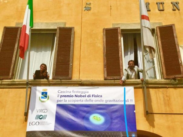 CASCINA (Pi) – Entusiasmo e grande soddisfazione anche in municipio a Cascina (Pisa) per la notizia dell’assegnazione del premio Nobel per la fisica alla scoperta delle onde gravitazionali con il contributo dell’osservatorio gravitazionale europeo Ego-Virgo, che ha sede sul territorio cascinese. Da stamani sulla facciata del palazzo comunale un grande striscione saluta l’assegnazione dell’ambitissimo riconoscimento scientifico anche all’osservatorio. Il logo del comune e quello di Ego-Virgo accompagnano la riproduzione dei due buchi neri la cui fusione ha generato le onde gravitazionali poi ascoltate per la prima volta il 14 settembre 2015, e la cui scoperta fu annunciata l’11 febbraio 2016, nel corso di una conferenza stampa congiunta tenutasi in contemporanea a Washington e a Cascina, nella sede dell’osservatorio. Analogo striscione, ma con il logo pisano, è stato esposto dal Comune di Pisa.