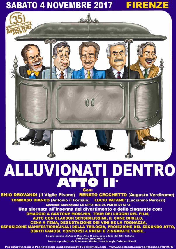 Al termine della cena la serata proseguirà nella storica location del Cinema Odeon con la proiezione prima del film L’ultima Zingarata ideata e prodotta da Francesco Conforti e dal regista Federico Micali e poi del mitico Amici Miei Atto II all’interno del quale sono presenti diverse scene che ricordano l’alluvione di Firenze del ’66 giorno proprio scelto per questo nostro evento.