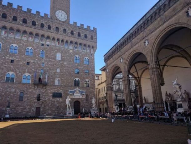 FIRENZE  – Piazza della Signoria ricoperta di terra, per apparire com’era nel ‘500: si presenta così una parte della piazza il 16 ottobre, giornata di riprese per il film sulla vita di Michelangelo che sta girando in varie località Andrei Konchalosvsky. Per ‘Il peccato. Una visione’ è stato transennato uno spazio di alcune decine di metri quadrati tra l’arengario di Palazzo Vecchio e la loggia dei Lanzi; una folla di turisti e curiosi scatta foto e selfie a questa inedita versione della piazza. Le riprese termineranno la sera del 16 ottobre, dopodichè , già dal 17 ottobre la piazza dovrebbe tornare alla normalità.