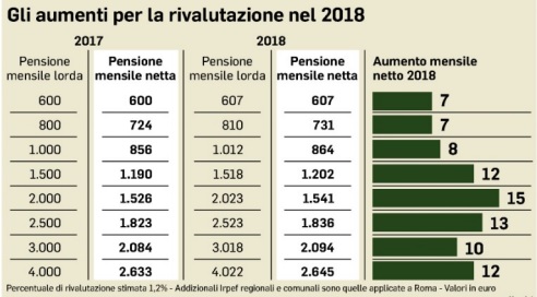 Per due anni, il numero è stato zero per tutti: l’andamento dei prezzi, piatto o addirittura in leggerissima discesa, ha fatto sì che nel 2016 e nel 2017 non scattasse nemmeno la parziale rivalutazione delle pensioni prevista dalla legge in vigore. Dal primo gennaio del 2018 però si ritorna agli aumenti per rivalutazione (tecnicamente si chiama perequazione): nei prossimi giorni l’Istat ufficializzerà una percentuale – calcolata in via provvisoria – che con ogni probabilità dovrebbe assestarsi all’1,2 per cento; ma questo incremento non sarà pieno per gli assegni superiori a tre volte il trattamento minimo Inps.