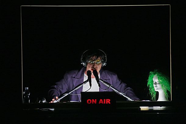 Quando il pubblico entra in sala trova Latini sdraiato su una panchina, mezzo addormentato; cala il silenzio a segnare l’inizio e quella figura si porta alla luce, rivelando un DJ queer. Labbra rosse, parrucca arruffata, occhiali neri, cuffie sulle orecchie e sintonizzate sui Placebo, il DJ raggiunge una postazione radiofonica da cui trasmettere “On Air”, come segnala la scritta luminosa che gli campeggia davanti. La musica si affievolisce, inizia il racconto e le parole, mai trattenute, si impregnano di melodia, scandiscono il ritmo, tutto è ora dolcezza e rarefazione. La sacralità del Cantico pronunciata da Latini, su una notazione di pianoforte classico intervallata da incursioni pop, è la sensualità di una voce profonda, che scandisce i versi di un amore biblico infondendo loro la verità della carne, la sensualità dell’immaginazione. Nel finale, come a ricordarci che per rendere sacro l’amore assoluto – per un altro essere umano o per il divino – ci vuole uno sforzo e una totale abnegazione, Roberto Latini, nella sua fragile umanità, rinuncia agli artifici per offrirsi, stanco e sudato, a un ultimo crescendo di voce e canto.