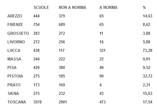 Un’inchiesta dell’Espresso, che risale a giugno 2017 ma è ancora attuale, ci ha riportato alla dura realtà. Nonostante promesse e chiacchiere dei tanti Governi succedutisi dal 2003 ad oggi, in base ai dati sull’edilizia scolastica resi noti dal Miur, 9 edifici su 10 non sarebbero a norma antisismica. Il dato a livello toscano non è molto migliore: solo il 17,5% degli edifici rispetterebbe i criteri (parliamo di 473 scuole su 3578).