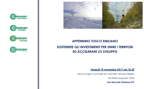 Si svolgerà venerdì 10 novembre, a San Marcello Pistoiese (PT), l’iniziativa “Appennino Tosco – Emiliano. Sostenere gli investimenti per unire i territori ed accelerare lo sviluppo” organizzata da Confesercenti Toscana, Confesercenti Emilia Romagna, Confesercenti Pistoia, Confesercenti Bologna ed in collaborazione con il Comune di San Marcello Pistoiese Piteglio.
