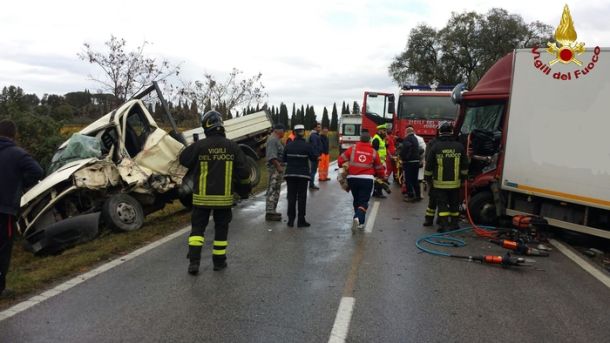 Grosseto: scontro frontale tra furgone e camion. Due feriti estratti dall’abitacolo dai vigili del fuoco