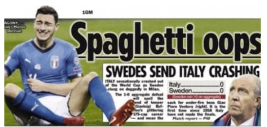 L’apertura del The Sun è ironica: “Spaghetti oops”. Anche il Mirror non è tenero: “Italian Sob”. Sempre in Inghilterra, il Daily Mail, edizione online, parla di “Cuore spezzato” con, in bella evidenza, l’immagine del capitano Buffon in lacrime.