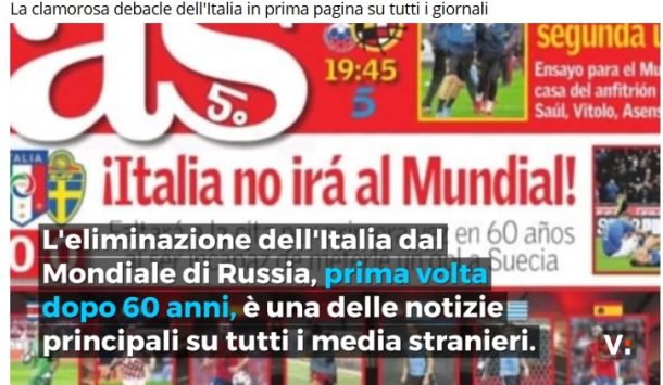 ROMA – La clamorosa eliminazione dell’Italia dal Mondiale di Russia, la prima volta dopo 60 anni, è una delle notizie principali su tutti i media stranieri. C’è chi rende merito alla ventennale carriera in azzurro di Buffon, arrivata alla fine, chi invece preferisce infierire sulle sorti azzurre.