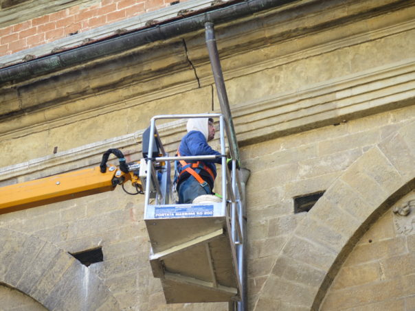Anche per seguire l’invito recente del Soprintendente Andrea Pessina abbiamo oggi iniziato un’ispezione accurata della facciata laterale e degli interni della basilica di San Lorenzo. A mezzo di una gru un verificatore ha saggiato le pareti esterne dell’edificio, pietre e fregi, provvedendo a togliere qualche pezzo che poteva costituire pericolo in modo da garantire ancor di più la sicurezza delle persone, che era peraltro già stata garantita a sufficienza da precedenti interventi.